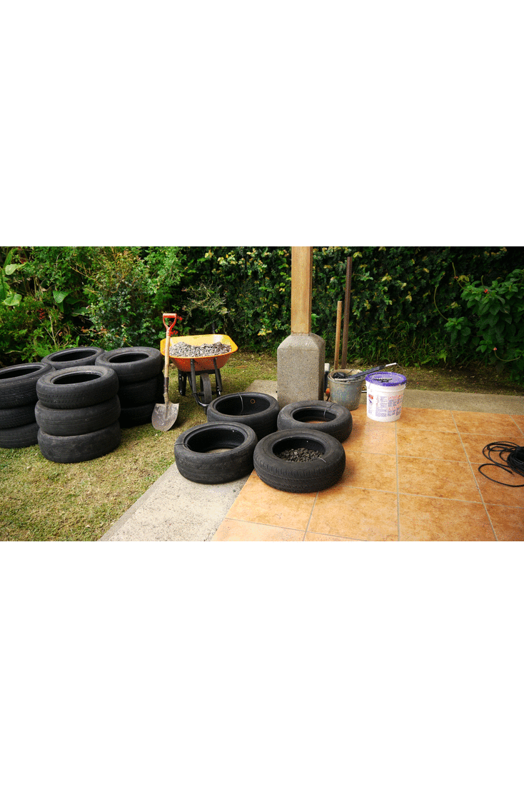 La base se hizo con llantas viejas rellenas de escombros que me traje de una construcción cercana, se hizo una base de tabla de formaleta usada (de la misma construcción).